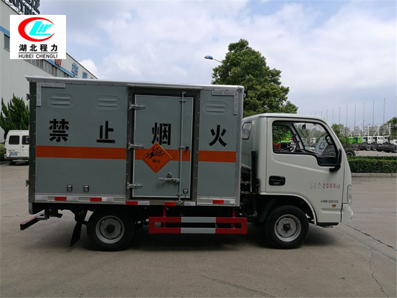 4mm厚的鋼板制作,廂體底部鋪有防靜電膠皮,廂體兩側安裝固定貨物卡槽或臥環,廂體頂部中間位置安裝煙霧報警器,后門及側門安裝防盜報警器,廂體前面鋪靜電膠皮,帶側門,后雙門,廂體顏色根據客戶要求變換,帶兩只滅火器和排氣管防火罩、三角危險品頂燈,其余標配。